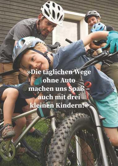 Die fünfköpfige Familie verbindet das tägliche Pendeln zur Arbeit oder Schule mit ihrem gemeinsamen Hobby, dem Radfahren. Die beiden Älteren genießen es, selbstständig in die Pedale zu treten, und der Kleinste lässt sich gerne von seinen Eltern im Kindersitz oder im Anhänger chauffieren.